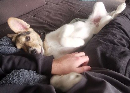 Er hat sich innerhalb der ersten 24 Stunden super eingelebt bei uns. Bis jetzt ist er super unkompliziert und lernt schnell. Vom ersten Tag an war das widerwillige Spazierengehen Geschichte. Stubenrein war er auch von selbst, bis auf ein Malheur in der ersten Nacht. Die erste Party bei uns mit vielen Leuten hat er auch super überstanden, mitten in der Tür zu schlafen, so dass alle über ihn steigen müssen, fand er besonders toll. Andere Tiere, Kinder, Treppen, Autofahren... Alles kein Problem.