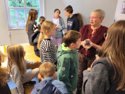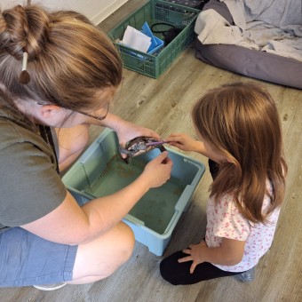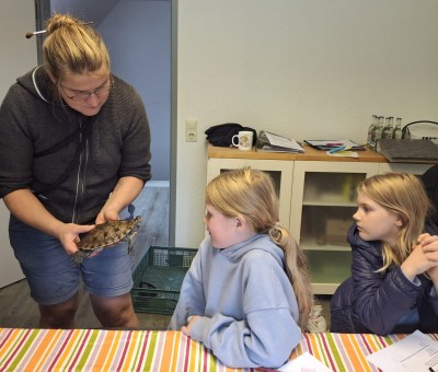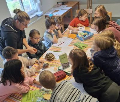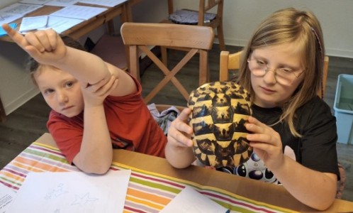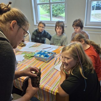 Begeistert war die Gruppe von der Wasserschildkröte, die Ann-Kristin Beinhorn mitgebracht hatte und die ganz aus der Nähe betrachtet werden konnte. Als Anschauungsmaterial konnten außerdem Schildkrötenpanzer untersucht werden, und die Kinder fragten sich beeindruckt, wie das Tier dort überhaupt hineinpasst.