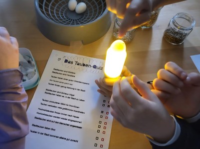 Zum Schutz der Stadttauben und zur Verringerung ihrer Population berichteten Lena und Gabi von verschiedenen Projekten: Beeindruckt waren die Kinder von dem Vorgehen, echte Taubeneier gegen Kunsteier auszutauschen. Thematisiert wurde auch das Leid der Hochzeitstauben, die nicht, wie viele denken, wieder zurück zu einem Taubenschlag finden, sondern - sich selbst überlassen - keinerlei Überlebenschance haben.